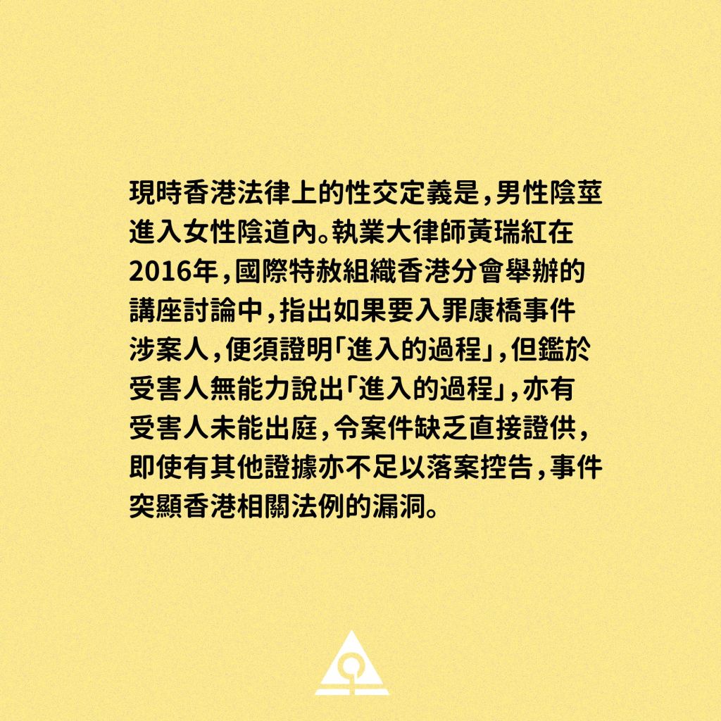 現時香港法律上的性交定義是,男性陰莖進入女性陰道內。執業大律師黃瑞紅在2016年,國際特赦組織香港分會舉辦的講座討論中,指出如果要入罪康橋事件涉案人,便須證明「進入的過程」,但鑑於受害人無能力說出「進入的過程」,亦有受害人未能出庭,令案件缺乏直接證供,即使有其他證據亦不足以落案控告,事件突顯香港相關法例的漏洞。