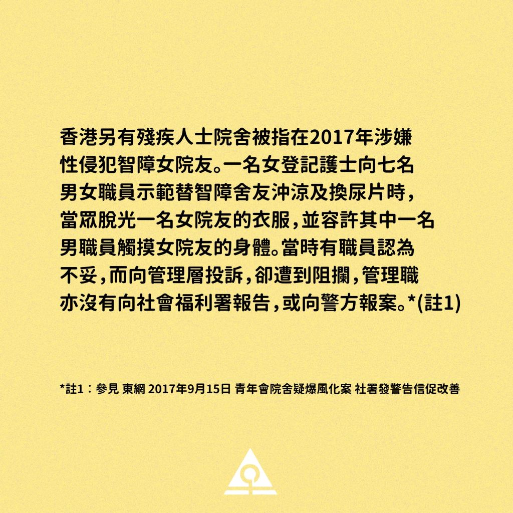 香港另有殘疾人士院舍被指在2017年涉嫌性侵犯智障女院友。一名女登記護士向七名男女職員示範替智障舍友沖涼及換尿片時,當眾脫光一名女院友的衣服,並容許其中一名男職員觸摸女院友的身體。當時有職員認為不妥,而向管理層投訴,卻遭到阻攔,管理職亦沒有向社會福利署報告,或向警方報案。*(註1)