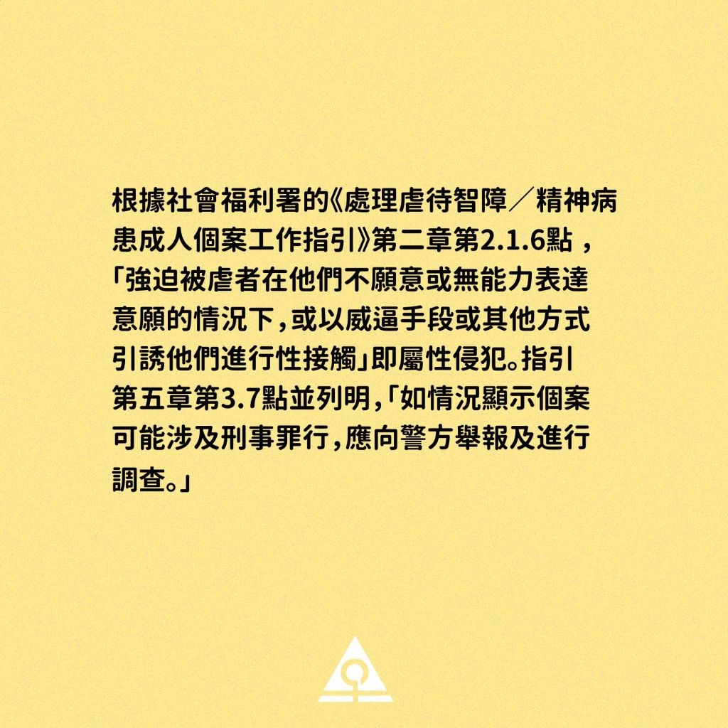 根據社會福利署的《處理虐待智障/精神病患成人個案工作指引》第二章第2.1.6點 ,「強迫被虐者在他們不願意或無能力表達意願的情況下,或以威逼手段或其他方式引誘他們進行性接觸」即屬性侵犯。指引第五章第3.7點並列明,「如情況顯示個案可能涉及刑事罪行,應向警方舉報及進行調查。」