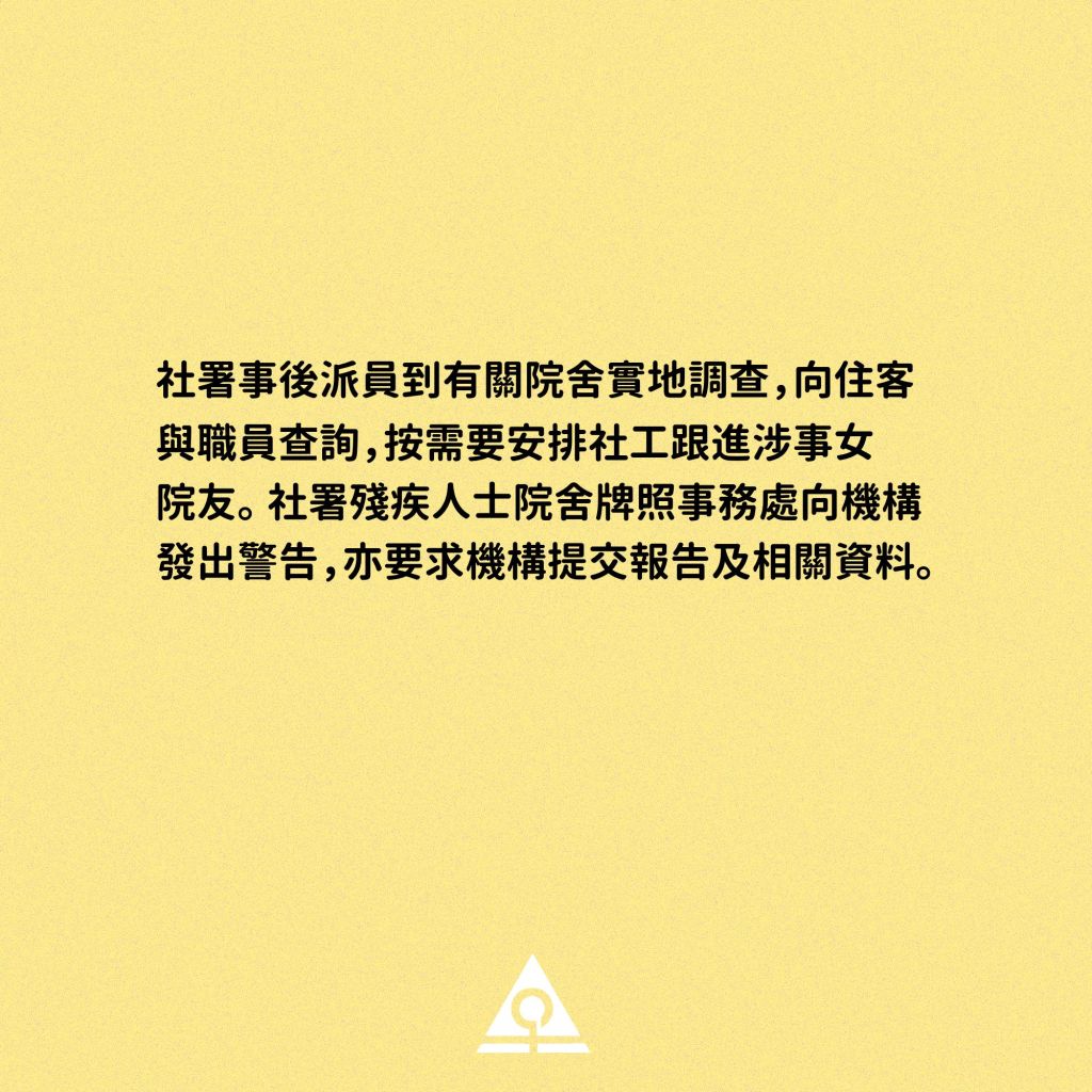 社署事後派員到有關院舍實地調查,向住客與職員查詢,按需要安排社工跟進涉事女院友。 社署殘疾人士院舍牌照事務處向機構發出警告,亦要求機構提交報告及相關資料。