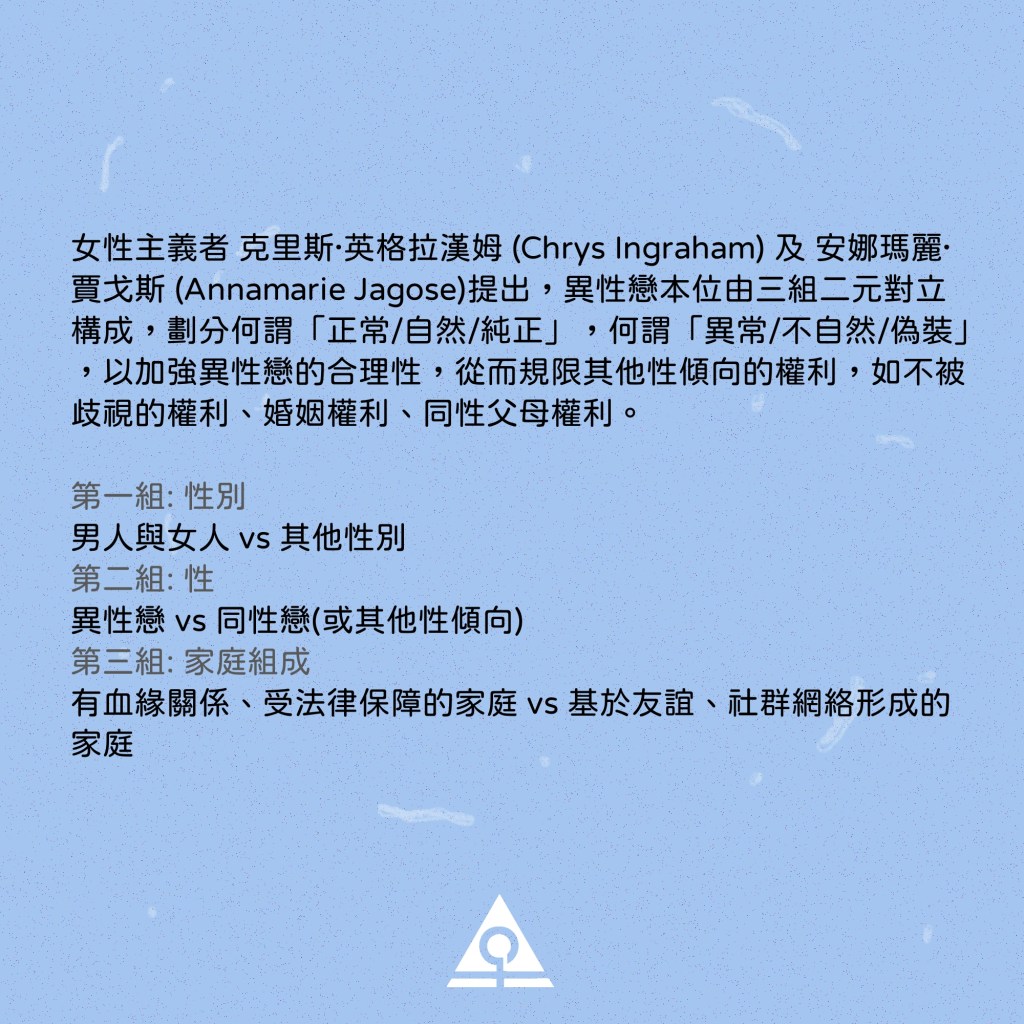 女性主義者 克里斯·英格拉漢姆 (Chrys Ingraham) 及 安娜瑪麗·賈戈斯 (Annamarie Jagose)提出,異性戀本位由三組二元對立構成,劃分何謂「正常/自然/純正」,何謂「異常/不自然/偽裝」,以加強異性戀的合理性,從而規限其他性傾向的權利,如不被歧視的權利、婚姻權利、同性父母權利。
