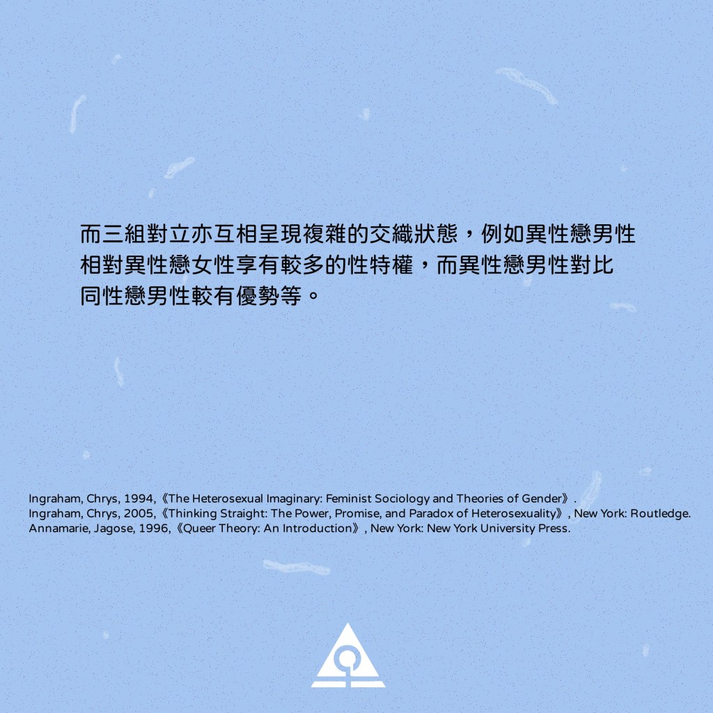 而三組對立亦互相呈現複雜的交織狀態,例如異性戀男性相對異性戀女性享有較多的性特權,而異性戀男性對比同性戀男性較有優勢等。