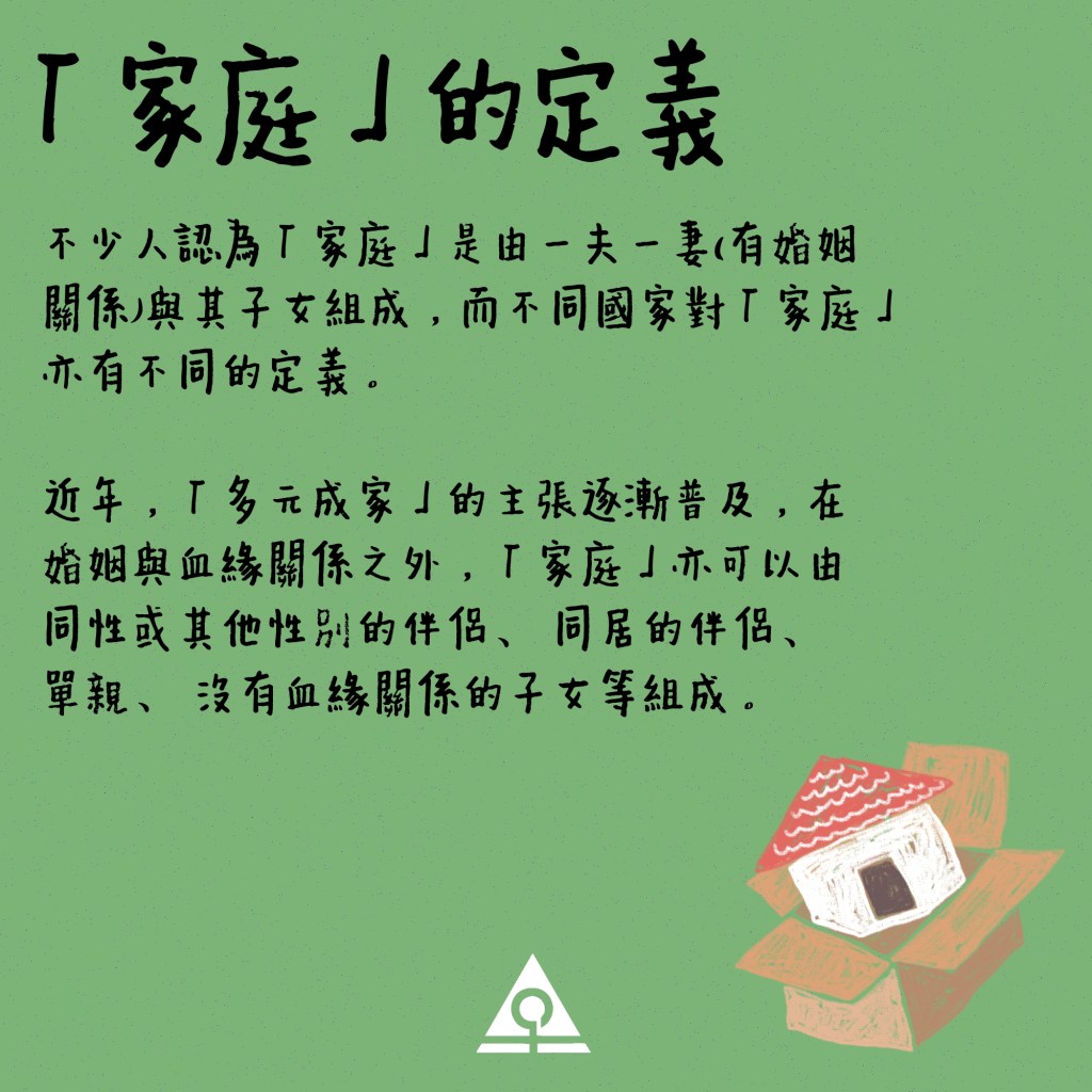 不少人認為「家庭」是由一夫一妻(有婚姻關係)與其子女組成,而不同國家對「家庭」亦有不同的定義。近年,「多元成家」的主張逐漸普及,在婚姻與血緣關係之外,「家庭」亦可以由同性或其他性別的伴侶﹑同居的伴侶﹑單親﹑沒有血緣關係的子女等組成。