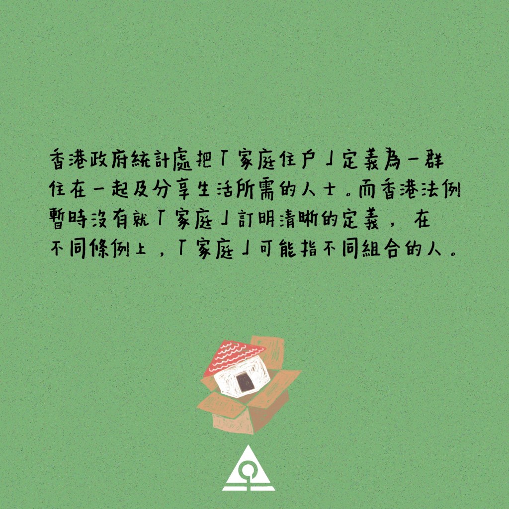 香港政府統計處把「家庭住戶」定義為一群住在一起及分享生活所需的人士。而香港法例暫時沒有就「家庭」訂明清晰的定義, 在不同條例上,「家庭」可能指不同組合的人。