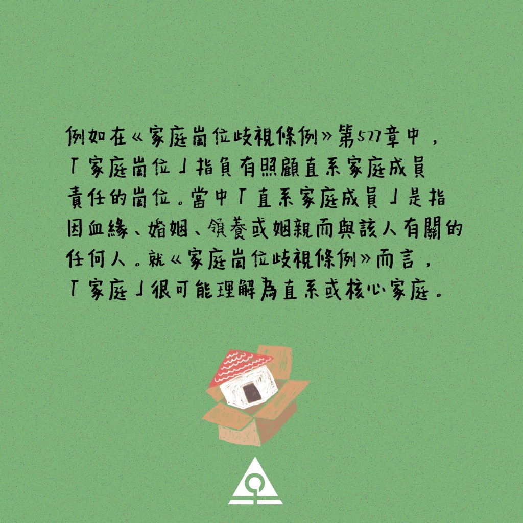 例如在《家庭崗位歧視條例》第527章中,「家庭崗位」指負有照顧直系家庭成員責任的崗位。當中「直系家庭成員」是指因血緣、婚姻、領養或姻親而與該人有關的任何人。就《家庭崗位歧視條例》而言,「家庭」很可能理解為直系或核心家庭。