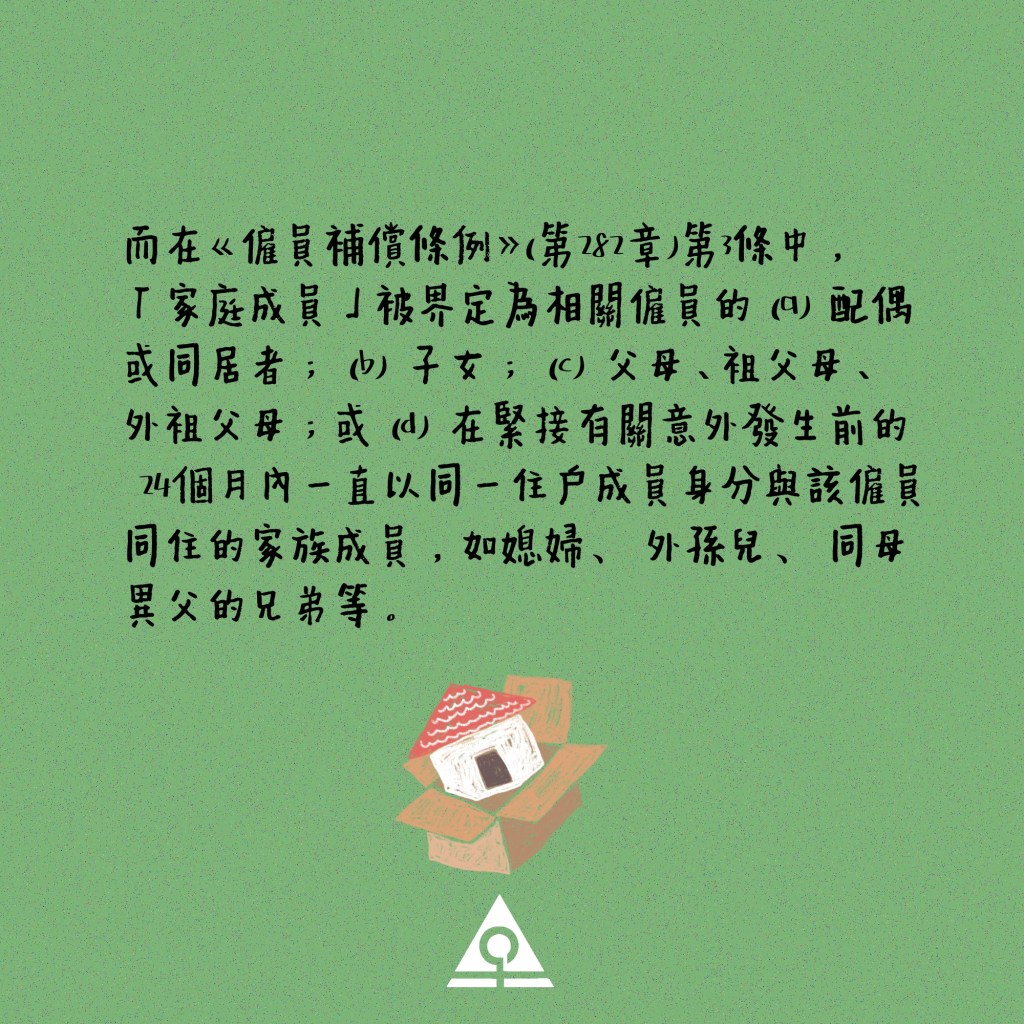 而在《僱員補償條例》(第282章)第3條中,「家庭成員」被界定為相關僱員的 (a) 配偶或同居者; (b) 子女; (c) 父母、祖父母、外祖父母;或 (d) 在緊接有關意外發生前的 24個月內一直以同一住戶成員身分與該僱員同住的家族成員,如媳婦﹑外孫兒﹑同母異父的兄弟等。