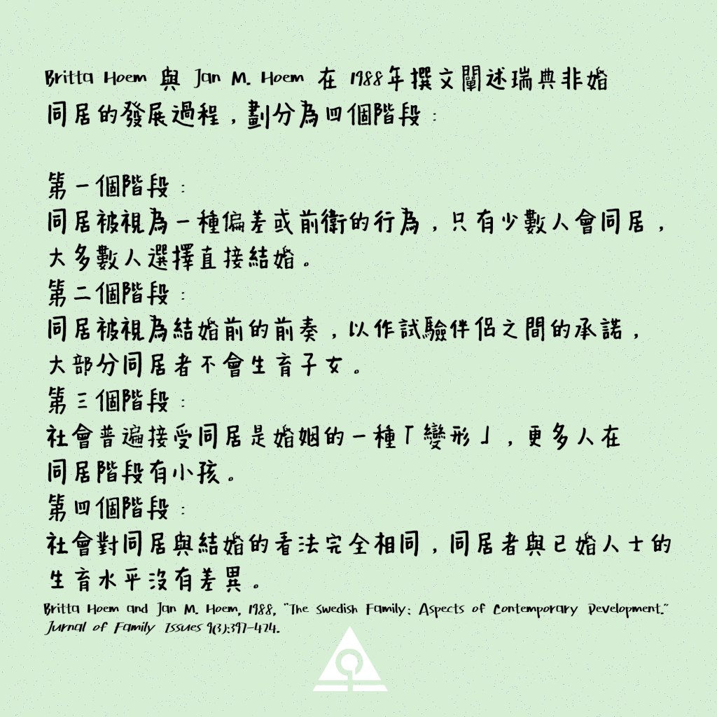 Britta Hoem 與 Jan M. Hoem 在 1988年撰文闡述瑞典非婚同居的發展過程,劃分為四個階段: