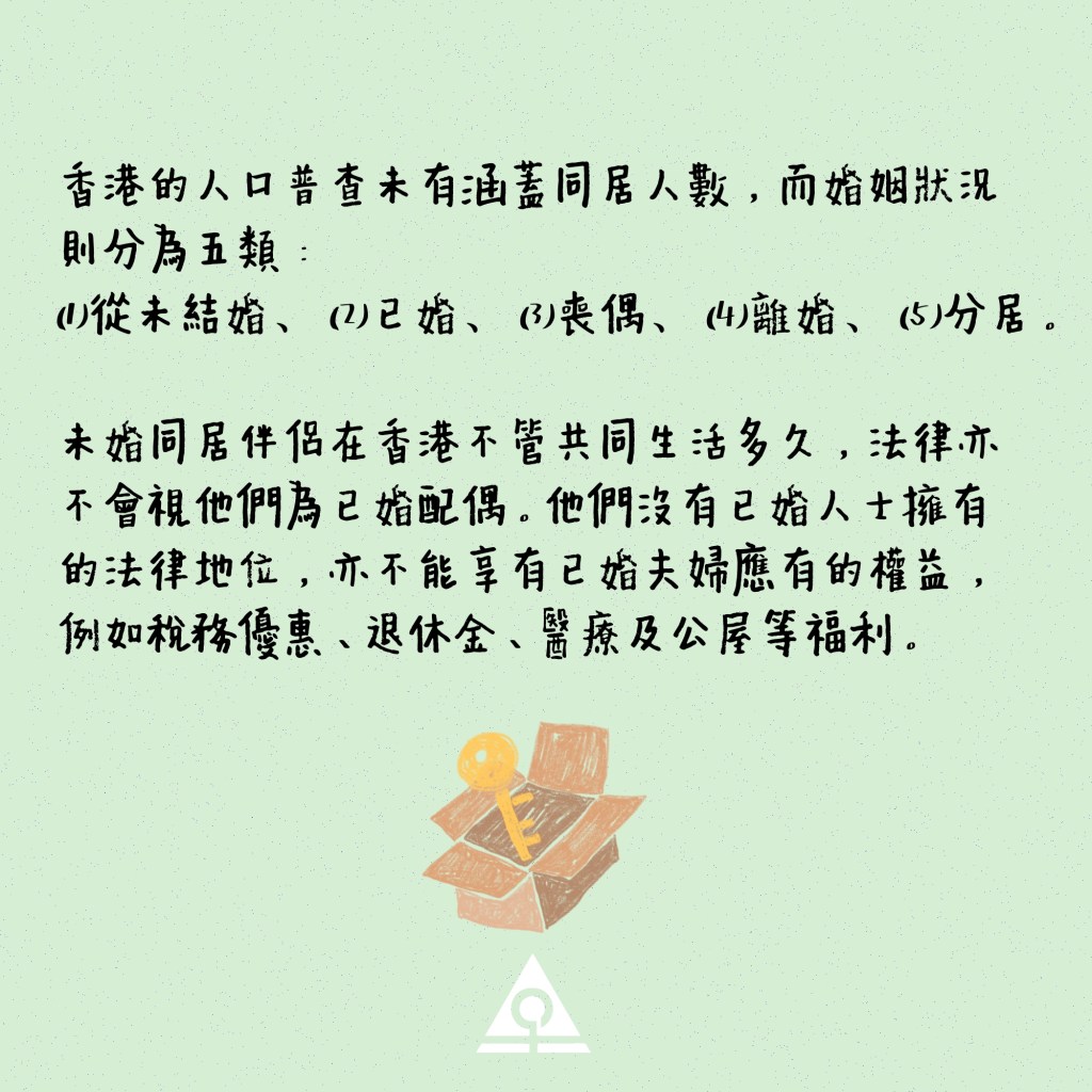 香港的人口普查未有涵蓋同居人數,而婚姻狀況則分為五類:(1)從未結婚﹑(2)已婚﹑(3)喪偶﹑(4)離婚﹑(5)分居。未婚同居伴侶在香港不管共同生活多久,法律亦不會視他們為已婚配偶。他們沒有已婚人士擁有的法律地位,亦不能享有已婚夫婦應有的權益,例如稅務優惠、退休金、醫療及公屋等福利。