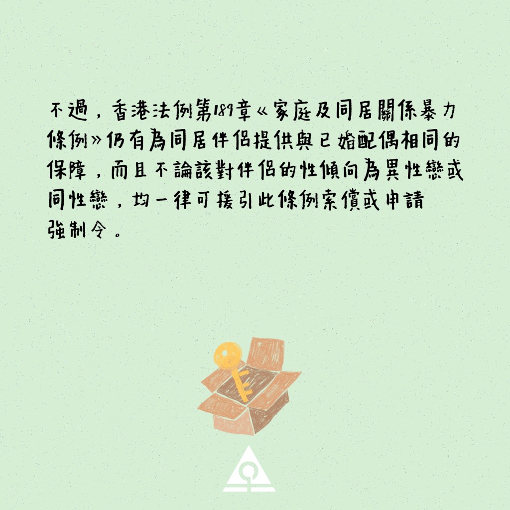 不過,香港法例第189章《家庭及同居關係暴力條例》仍有為同居伴侶提供與已婚配偶相同的保障,而且不論該對伴侶的性傾向為異性戀或同性戀,均一律可援引此條例索償或申請強制令。