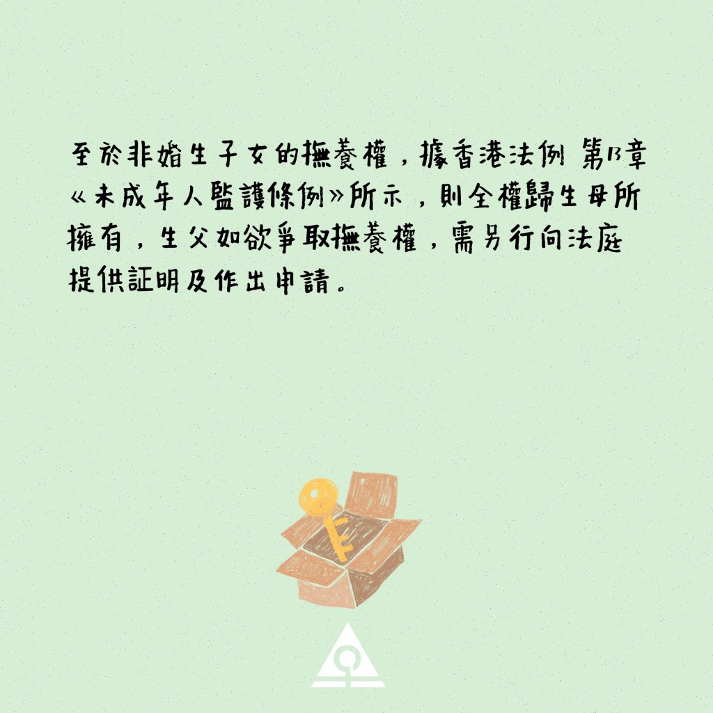 至於非婚生子女的撫養權,據香港法例 第13章《未成年人監護條例》所示,則全權歸生母所擁有,生父如欲爭取撫養權,需另行向法庭提供証明及作出申請。