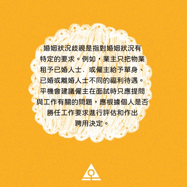 婚姻狀況歧視是指對婚姻狀況有特定的要求。例如,業主只把物業租予已婚人士﹑或僱主給予單身、已婚或離婚人士不同的福利待遇。平機會建議僱主在面試時只應提問與工作有關的問題,應根據個人是否勝任工作要求進行評估和作出聘用決定。