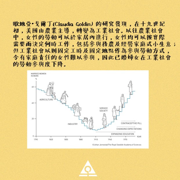 歌地亞·戈爾丁(Claudia Goldin) 的研究發現,在十九世紀初,美國由農業主導,轉變為工業社會。以往農業社會中,女性的勞動可以於家居內進行,女性均可以按實際需要而決定何時工作,包括參與務農及經營家庭式小生意;但工業社會以則固定工時及固定地點作為參與勞動方式,令有家庭責任的女性難以參與,因此已婚婦女在工業社會的勞動參與度下降。
