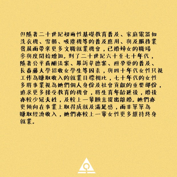 但隨著二十世紀初兩性基礎教育普及、家庭電器如洗衣機、雪櫃、吸塵機等的普及應用、與及服務業發展而帶來更多文職就業機會,已婚婦女的職場參與度開始增加。到了二十世紀六十至七十年代,隨著公平薪酬法案、羅訴韋德案、避孕藥的普及、長春藤大學招收女學生等因素,與四十年代女性只視工作為賺取收入的就業目標相比,七十年代的女性多將事業視為她們個人身份及社會貢獻的重要部份,追求更多接受教育的機會,將生育年齡延後,婚後亦較少冠夫姓,及較上一輩願意提出離婚。她們亦更傾向在事業上取得成就及滿足感,而非單單為賺取經濟收入,她們亦較上一輩女性更多維持終身就業。