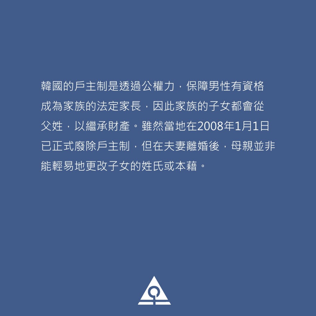 韓國的戶主制是透過公權力,保障男性有資格成為家族的法定家長,因此家族的子女都會從父姓,以繼承財產。雖然當地在2008年1月1日已正式廢除戶主制,但在夫妻離婚後,母親並非能輕易地更改子女的姓氏或本藉。