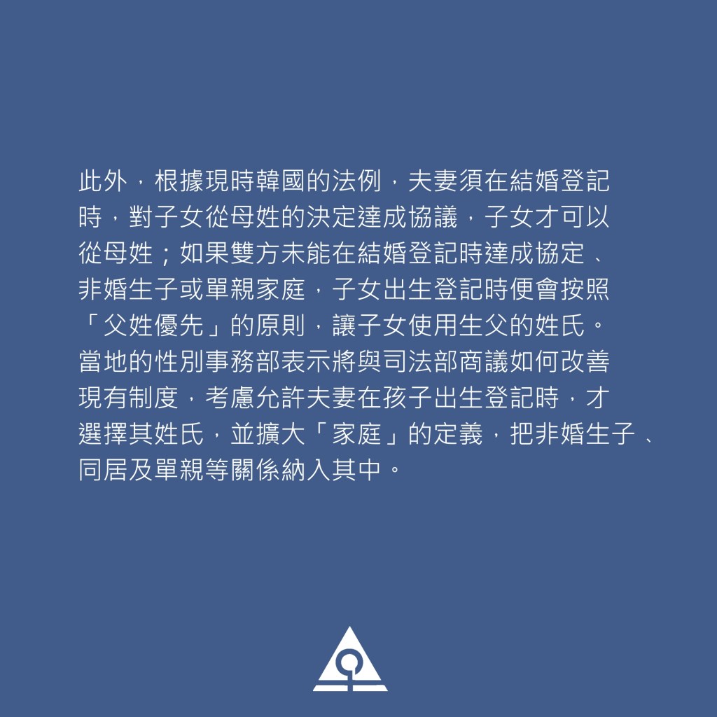 此外,根據現時韓國的法例,夫妻須在結婚登記時,對子女從母姓的決定達成協議,子女才可以從母姓;如果雙方未能在結婚登記時達成協定﹑非婚生子或單親家庭,子女出生登記時便會按照「父姓優先」的原則,讓子女使用生父的姓氏。當地的性別事務部表示將與司法部商議如何改善現有制度,考慮允許夫妻在孩子出生登記時,才選擇其姓氏,並擴大「家庭」的定義,把非婚生子﹑同居及單親等關係納入其中。