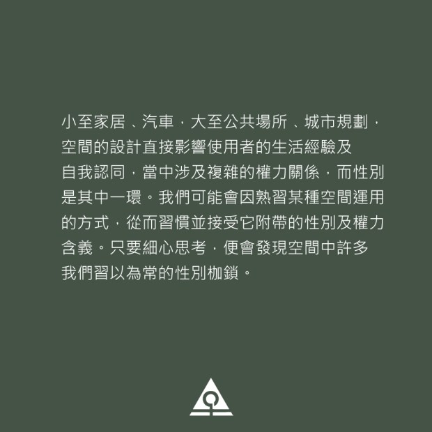 小至家居﹑汽車,大至公共場所﹑城市規劃,空間的設計直接影響使用者的生活經驗及自我認同,當中涉及複雜的權力關係,而性別是其中一環。我們可能會因熟習某種空間運用的方式,從而習慣並接受它附帶的性別及權力含義。只要細心思考,便會發現空間中許多我們習以為常的性別枷鎖。