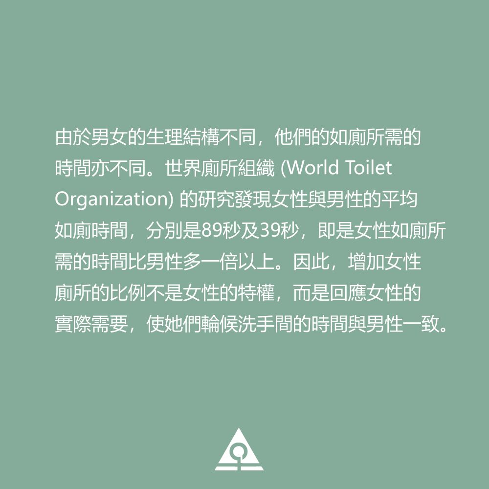 由於男女的生理結構不同,他們的如廁所需的時間亦不同。世界廁所組織 (World Toilet Organization) 的研究發現女性與男性的平均如廁時間,分別是89秒及39秒,即是女性如廁所需的時間比男性多一倍以上。因此,增加女性廁所的比例不是女性的特權,而是回應女性的實際需要,使她們輪候洗手間的時間與男性一致。