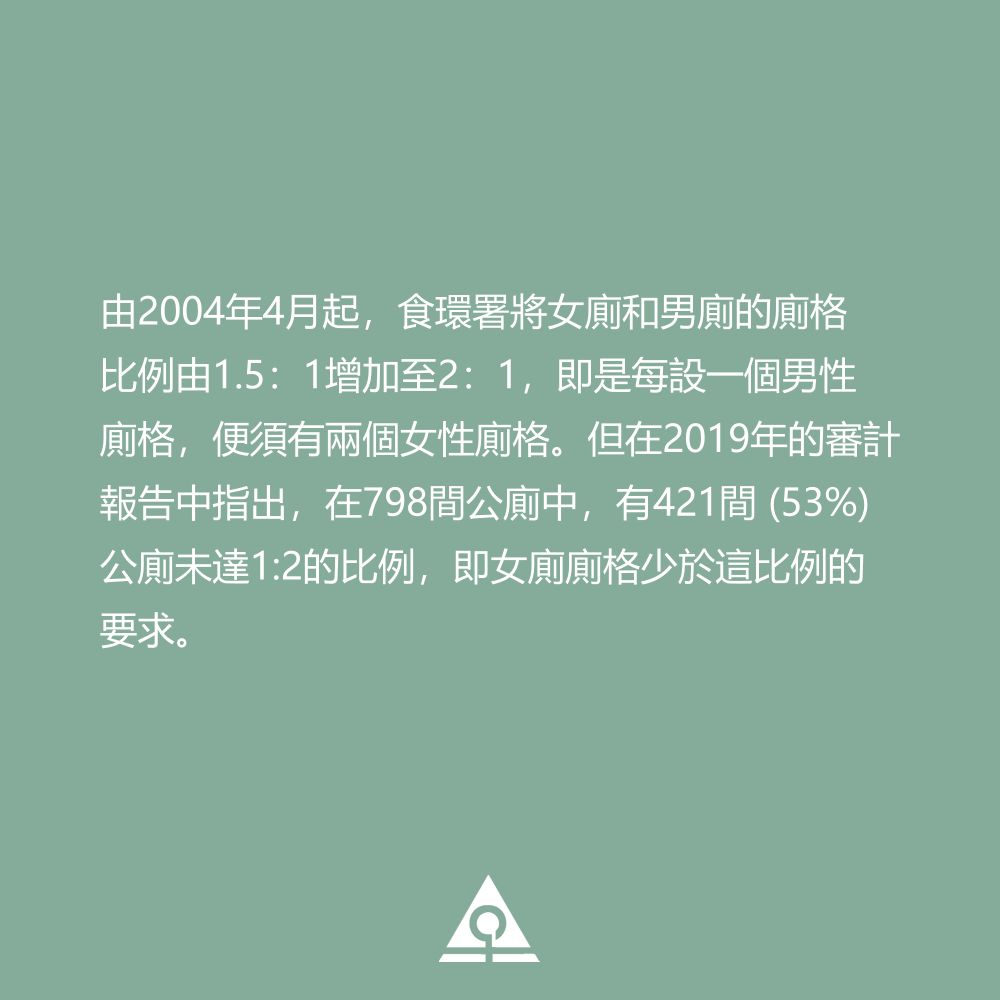 由2004年4月起,食環署將女廁和男廁的廁格比例由1.5:1增加至2:1,即是每設一個男性廁格,便須有兩個女性廁格。但在2019年的審計報告中指出,在798間公廁中,有421間 (53%) 公廁未達1:2的比例,即女廁廁格少於這比例的要求。