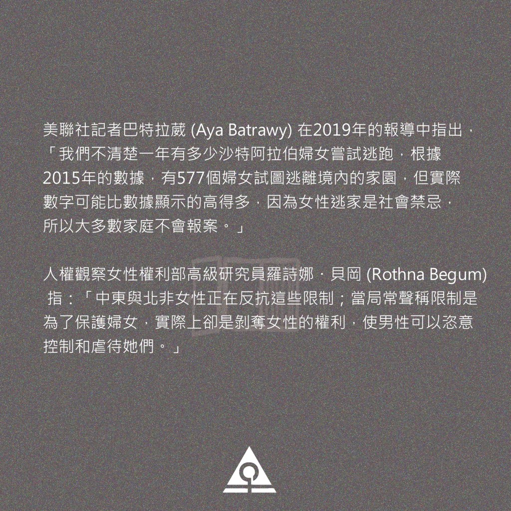 美聯社記者巴特拉葳 (Aya Batrawy) 在2019年的報導中指出,「我們不清楚一年有多少沙特阿拉伯婦女嘗試逃跑,根據2015年的數據,有577個婦女試圖逃離境內的家園,但實際數字可能比數據顯示的高得多,因為女性逃家是社會禁忌,所以大多數家庭不會報案。」