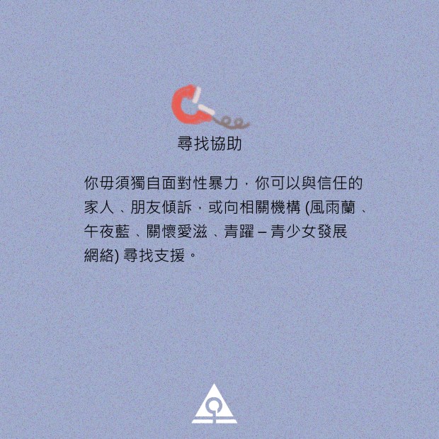 你毋須獨自面對性暴力,你可以與信任的家人﹑朋友傾訴,或向相關機構 (風雨蘭﹑午夜藍﹑關懷愛滋﹑青躍 – 青少女發展網絡) 尋找支援。