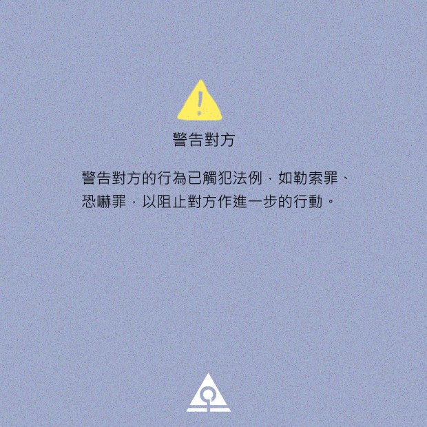 警告對方的行為已觸犯法例,如勒索罪、恐嚇罪,以阻止對方作進一步的行動。