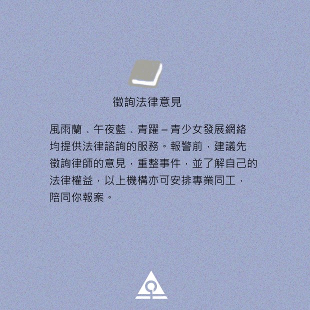 風雨蘭﹑午夜藍﹑青躍 – 青少女發展網絡均提供法律諮詢的服務。報警前,建議先徵詢律師的意見,重整事件,並了解自己的法律權益,以上機構亦可安排專業同工,陪同你報案。