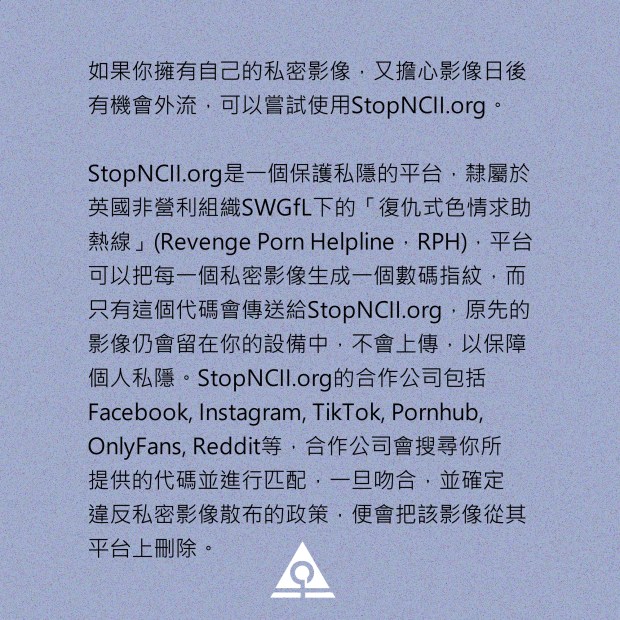 StopNCII.org是一個保護私隱的平台,隸屬於英國非營利組織SWGfL下的「復仇式色情求助熱線」(Revenge Porn Helpline,RPH),平台可以把每一個私密影像生成一個數碼指紋,而只有這個代碼會傳送給StopNCII.org,原先的影像仍會留在你的設備中,不會上傳,以保障個人私隱。StopNCII.org的合作公司包括Facebook, Instagram, TikTok, Pornhub, OnlyFans, Reddit等,合作公司會搜尋你所提供的代碼並進行匹配,一旦吻合,並確定違反私密影像散布的政策,便會把該影像從其平台上刪除。