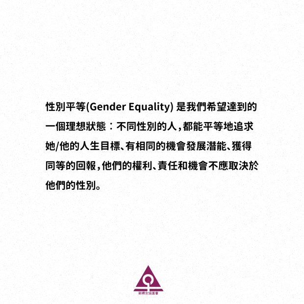性別平等(Gender Equality) 是我們希望達到的一個理想狀態︰不同性別的人,都能平等地追求她/他的人生目標、有相同的機會發展潛能、獲得同等的回報,他們的權利、責任和機會不應取決於他們的性別。