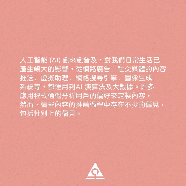 人工智能 (AI) 愈來愈普及,對我們日常生活已產生頗大的影響,從網路廣告﹑社交媒體的內容推送﹑虛擬助理﹑網絡搜尋引擎﹑圖像生成系統等,都運用到AI 演算法及大數據。許多應用程式通過分析用戶的偏好來定製內容,然而,這些內容的推薦過程中存在不少的偏見,包括性別上的偏見。