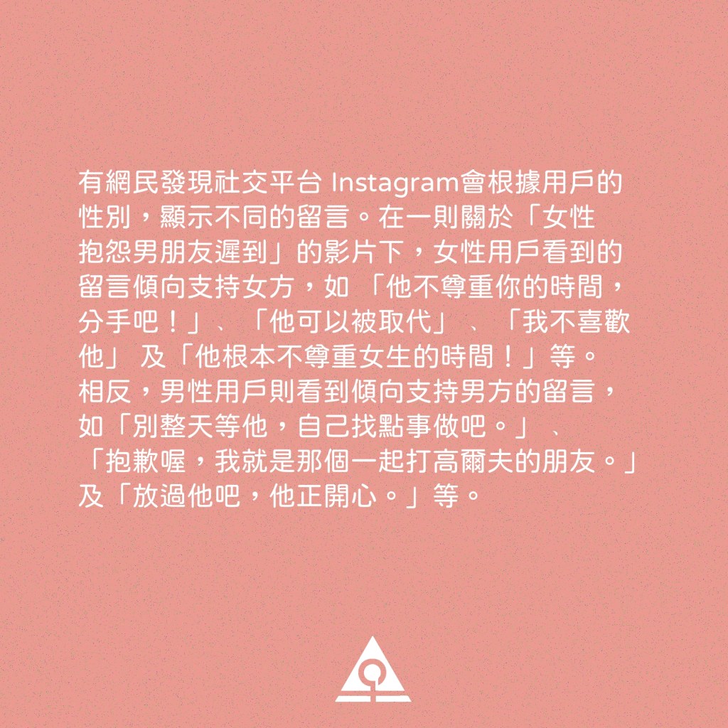 有網民發現社交平台 Instagram會根據用戶的性別,顯示不同的留言。在一則關於「女性抱怨男朋友遲到」的影片下,女性用戶看到的留言傾向支持女方,如 「他不尊重你的時間,分手吧!」﹑「他可以被取代」 ﹑「我不喜歡他」 及「他根本不尊重女生的時間!」等。相反,男性用戶則看到傾向支持男方的留言, 如「別整天等他,自己找點事做吧。」 ﹑「抱歉喔,我就是那個一起打高爾夫的朋友。」 及「放過他吧,他正開心。」等。