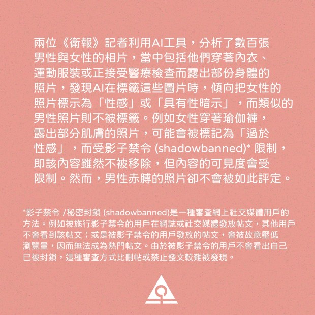 兩位《衛報》記者利用AI工具,分析了數百張男性與女性的相片,當中包括他們穿著內衣、運動服裝或正接受醫療檢查而露出部份身體的照片,發現AI在標籤這些圖片時,傾向把女性的照片標示為「性感」或「具有性暗示」,而類似的男性照片則不被標籤。例如女性穿著瑜伽褲,露出部分肌膚的照片,可能會被標記為「過於性感」,而受影子禁令 (shadowbanned)* 限制,即該內容雖然不被移除,但內容的可見度會受限制。然而,男性赤膊的照片卻不會被如此評定。