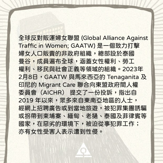 全球反對販運婦女聯盟 (Global Alliance Against Traffic in Women; GAATW) 是一個致力打擊婦女人口販賣的非政府組織,總部設於泰國曼谷,成員遍布全球,涵蓋女性權利、勞工權利、移民與社會正義等領域的組織。2023年2月8日,GAATW 與馬來西亞的 Tenaganita 及印尼的 Migrant Care 聯合向東盟政府間人權委員會(AICHR) 提交了一份投訴,指出自 2019 年以來,眾多來自東南亞地區的人士,經網上招聘廣告或到當地旅遊,被犯罪集團誘騙或拐帶到柬埔寨、緬甸、老撾、泰國及菲律賓等國家,在惡劣的環境下,被迫從事犯罪工作;亦有女性受害人表示遭到性侵。