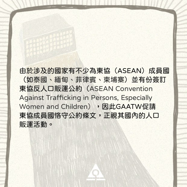由於涉及的國家有不少為東協(ASEAN)成員國(如泰國、緬甸、菲律賓、柬埔寨)並有份簽訂東協反人口販運公約(ASEAN Convention Against Trafficking in Persons, Especially Women and Children),因此GAATW促請東協成員國恪守公約條文,正視其國內的人口販運活動。