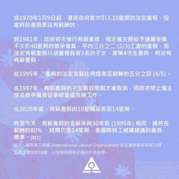 註1 :國際勞工組織 (International Labour Organisation) 定出產假最短為期14週,並建議增加到18週,以保障母親有足夠的休息時間。