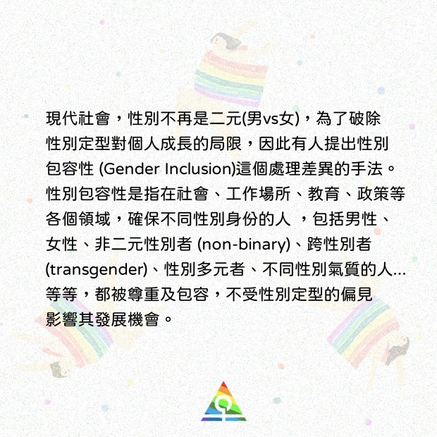 性別包容性強調人人有權表達不同的性別身份,尊重性別的多樣性與流動性,消除在制度或文化中,對性別的歧視與偏見,並為不同性別身份的人提供安全、支持和公平的空間。