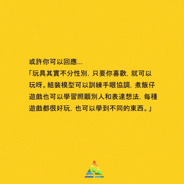 「玩具其實不分性別,只要你喜歡,就可以玩呀。組裝模型可以訓練手眼協調,煮飯仔遊戲也可以學習照顧別人和表達想法,每種遊戲都很好玩,也可以學到不同的東西。」