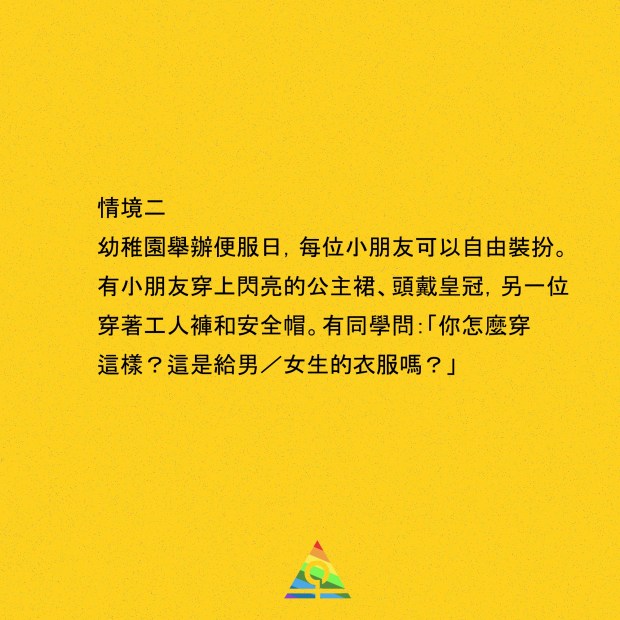 幼稚園舉辦便服日,每位小朋友可以自由裝扮。有小朋友穿上閃亮的公主裙、頭戴皇冠,另一位穿著工人褲和安全帽。有同學問:「你怎麼穿這樣?這是給男/女生的衣服嗎?」