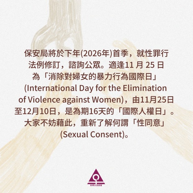 保安局將於下年(2026年)首季,就性罪行法例修訂,諮詢公眾。適逢11 月 25 日為「消除對婦女的暴力行為國際日」(International Day for the Elimination of Violence against Women),由11月25日至12月10日,是為期16天的「國際人權日」。大家不妨藉此,重新了解何謂「性同意」(Sexual Consent)。
