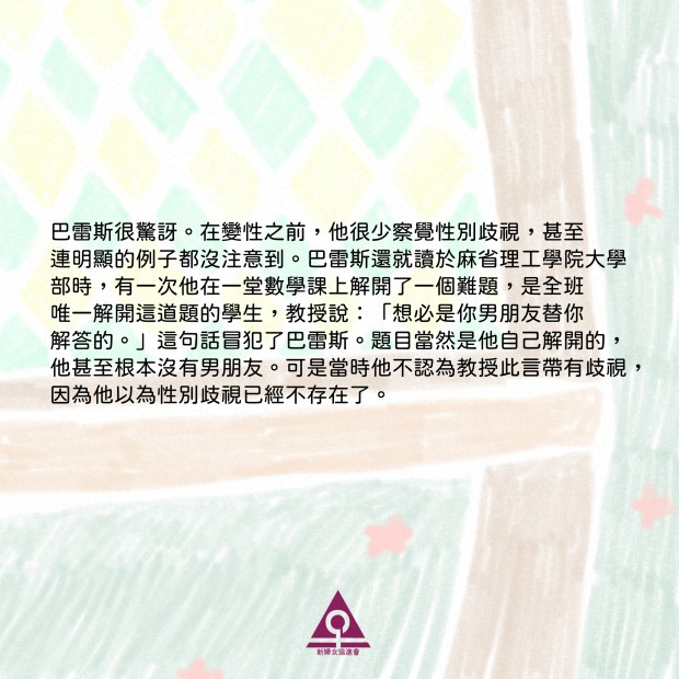 巴雷斯很驚訝。在變性之前,他很少察覺性別歧視,甚至連明顯的例子都沒注意到。巴雷斯還就讀於麻省理工學院大學部時,有一次他在一堂數學課上解開了一個難題,是全班唯一解開這道題的學生,教授說:「想必是你男朋友替你解答的。」這句話冒犯了巴雷斯。題目當然是他自己解開的,他甚至根本沒有男朋友。可是當時他不認為教授此言帶有歧視,因為他以為性別歧視已經不存在了。