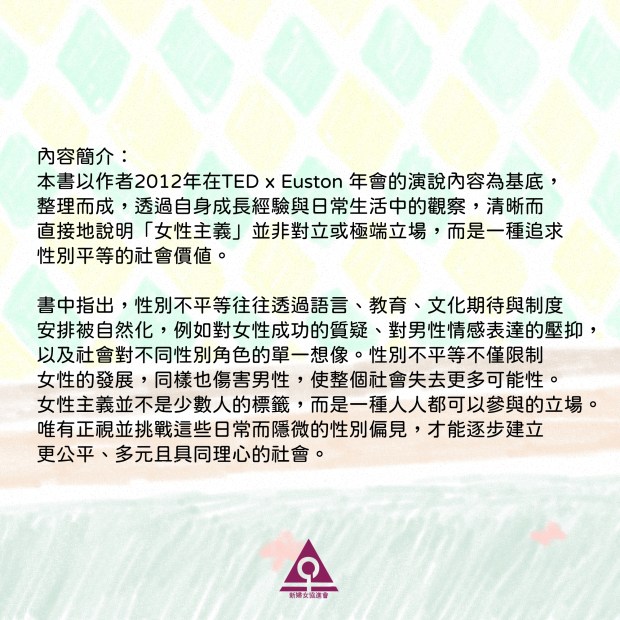 書中指出,性別不平等往往透過語言、教育、文化期待與制度安排被自然化,例如對女性成功的質疑、對男性情感表達的壓抑,以及社會對不同性別角色的單一想像。性別不平等不僅限制女性的發展,同樣也傷害男性,使整個社會失去更多可能性。女性主義並不是少數人的標籤,而是一種人人都可以參與的立場。唯有正視並挑戰這些日常而隱微的性別偏見,才能逐步建立更公平、多元且具同理心的社會。