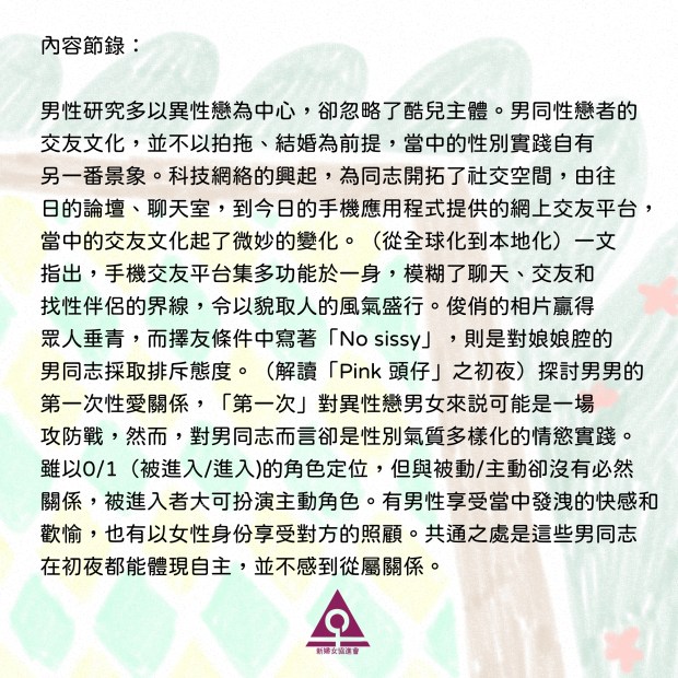 男性研究多以異性戀為中心,卻忽略了酷兒主體。男同性戀者的交友文化,並不以拍拖、結婚為前提,當中的性別實踐自有另一番景象。科技網絡的興起,為同志開拓了社交空間,由往日的論壇、聊天室,到今日的手機應用程式提供的網上交友平台,當中的交友文化起了微妙的變化。(從全球化到本地化)一文指出,手機交友平台集多功能於一身,模糊了聊天、交友和找性伴侶的界線,令以貌取人的風氣盛行。俊俏的相片贏得眾人垂青,而擇友條件中寫著「No sissy」,則是對娘娘腔的男同志採取排斥態度。(解讀「Pink 頭仔」之初夜)探討男男的第一次性愛關係,「第一次」對異性戀男女來説可能是一場攻防戰,然而,對男同志而言卻是性別氣質多樣化的情慾實踐。雖以0/1(被進入/進入)的角色定位,但與被動/主動卻沒有必然關係,被進入者大可扮演主動角色。有男性享受當中發洩的快感和歡愉,也有以女性身份享受對方的照顧。共通之處是這些男同志在初夜都能體現自主,並不感到從屬關係。