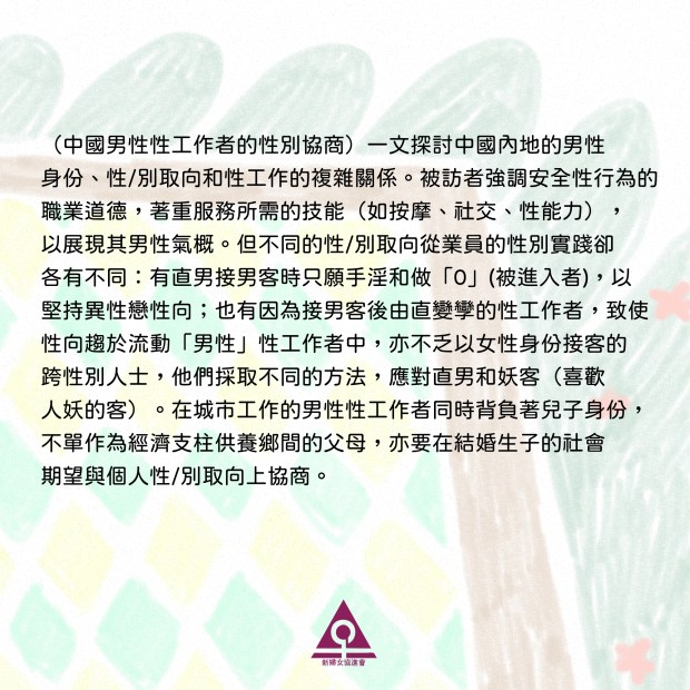(中國男性性工作者的性別協商)一文探討中國內地的男性身份、性/別取向和性工作的複雜關係。被訪者強調安全性行為的職業道德,著重服務所需的技能(如按摩、社交、性能力),以展現其男性氣概。但不同的性/別取向從業員的性別實踐卻各有不同:有直男接男客時只願手淫和做「0」(被進入者),以堅持異性戀性向;也有因為接男客後由直變孿的性工作者,致使性向趨於流動「男性」性工作者中,亦不乏以女性身份接客的跨性別人士,他們採取不同的方法,應對直男和妖客(喜歡人妖的客)。在城市工作的男性性工作者同時背負著兒子身份,不單作為經濟支柱供養鄉間的父母,亦要在結婚生子的社會期望與個人性/別取向上協商。